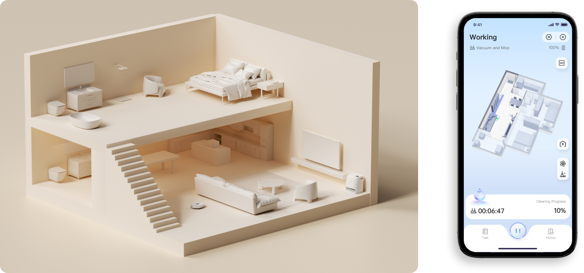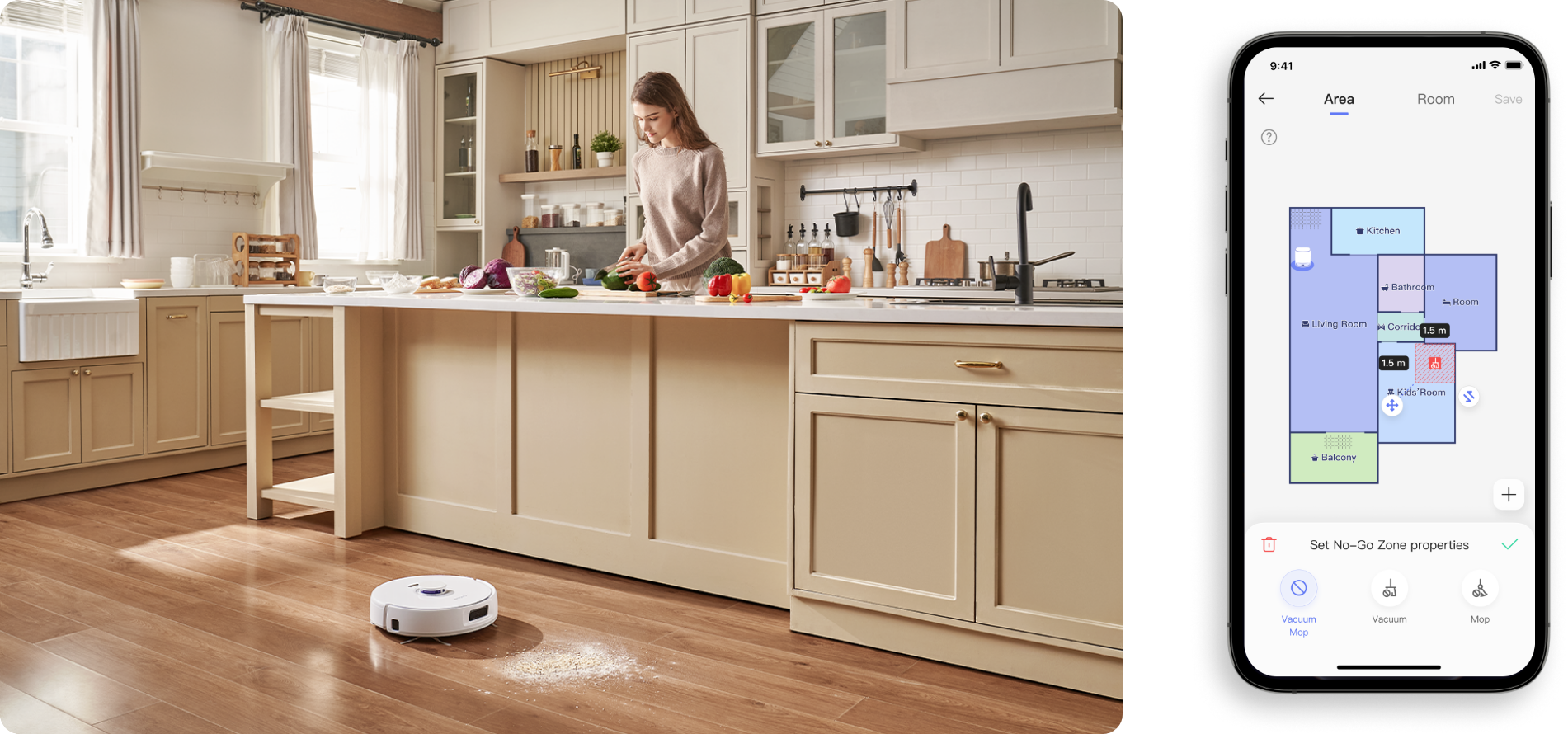 Recognizes rooms and floor types via 3D mapping and recommends the best cleaning solutions.