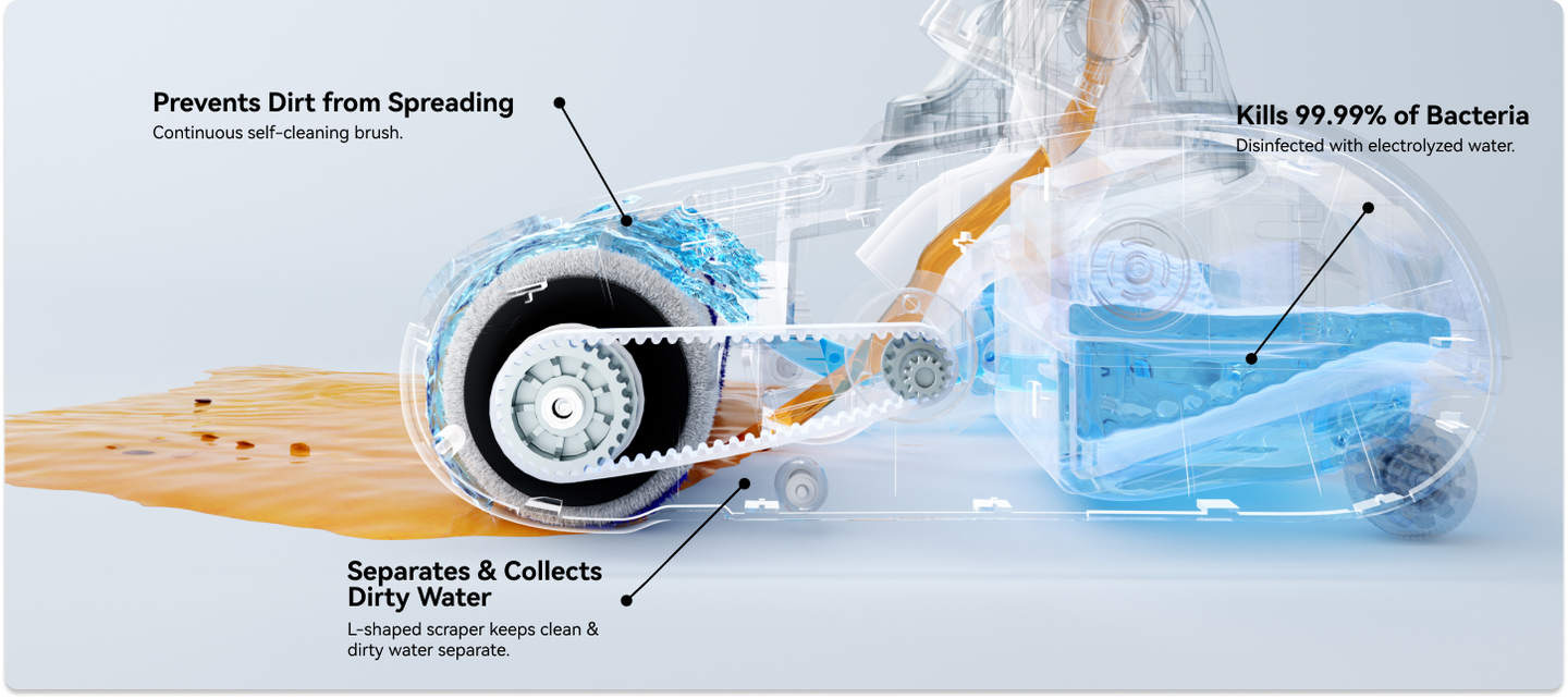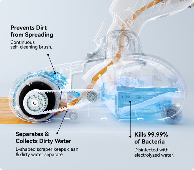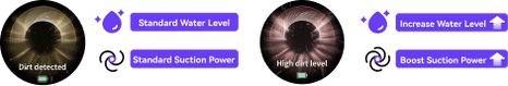 Intelligently measures dirt level and auto-adjusts suction and water levels for efficient and uninterrupted cleaning.